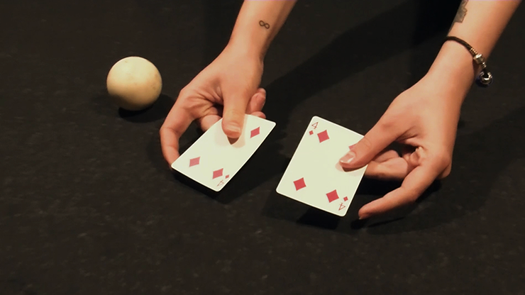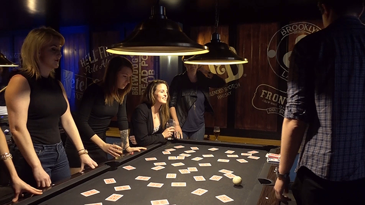 The magician explains he has two decks, one red the other blue. He places the blue deck aside explaining he will come back to that deck later. The other (red) deck is then opened and shuffled by the spectator, never touched by the magician at any point throughout the routine. Once shuffled and seen to be all different, they are then spread face down by the spectator all over the snooker/pool table, covering as much of the table as possible. The white snooker ball is then used, with any starting point chosen by the spectator, hit anywhere on the table, thus randomly selects a playing card. The card the white ball lands closest to is the one that will be used for the effect. The spectator can even have the choice to hit the ball again if they wish to select another card, it really is that free. All other surrounding cards are removed and the selected card is moved to the center of the table, still face down by the spectator. You never touch the selected card. The other deck now comes into play. The deck is opened and spread, with one face down card seen. This is also placed face down onto the center of the table, next to the other card. One blue back and one red back card are now facing down on the table. Both are turned over by the spectator and are seen to match. The card randomly selected by the spectator with the white ball matches the one and only face down card in the other deck.