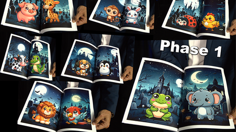 When you show the book (phase 1) it will appear adorable little animals that are so cute that kids will laugh because they are not scary at all. Then you react like something went wrong and you manage to understand what you need to do to make them appear. It's the magic word. The magic word is shout it out (phase 2) and when you open the book again there are no monsters, no animals nothing. (phase 3) At the end with one helper or the help of everyone you will make them appear.