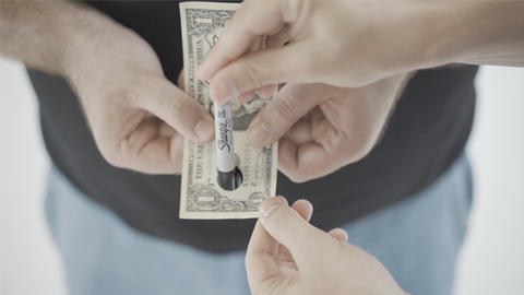 Black Lips turns a simple black sticker into a real, physical black hole. A borrowed and signed bill receives a round black sticker... and that sticker becomes a Black Hole through which objects can genuinely pass.