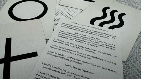 The 25 cards feature the classic symbols repeated five times, together withthree instructional cards that detail the history of the ESP cards, their design,and how to use them to actually test for ESP! These are great for curiousspectators, as they don't reveal anything they shouldn't, but for casualperformances fit the vibe perfectly, and the design is subtle enough that thecards can easily pass as an actual product for testing ESP, rather than a prop.