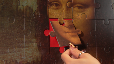 On stage, a picture frame is hidden beneath a velvet shroud as the magician calls up a volunteer. He presents a box of mixed puzzles pieces and invites the spectator to select one. He also presents a selection of cards, each with a different famous painting on it, and the volunteer chooses one as well.