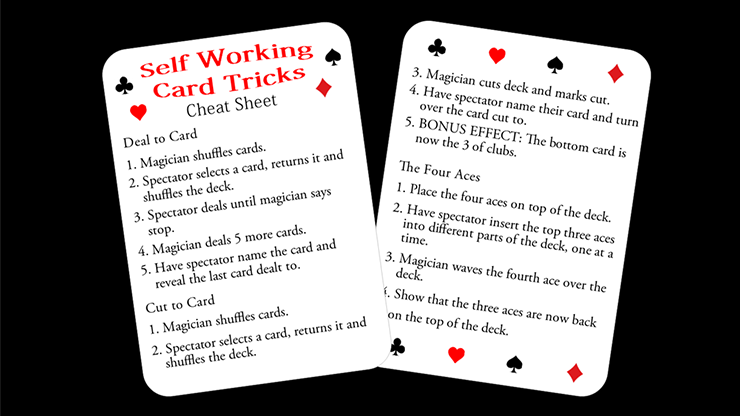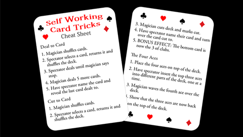 Self Starter is a single card that appears to be a "cheat sheet" for magicians who are learning new tricks. The card outlines three effects, which you guide your spectators through, allowing them to perform the effects for you!