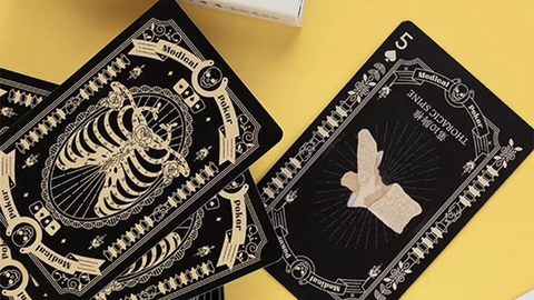 Medical Poker (Black Edition) Playing Cards featuring anatomical illustrations and medical themes. The cards depict various anatomical structures, such as a rib cage on the card box and a skull on the Joker card. The design integrates medical imagery with traditional playing card elements.